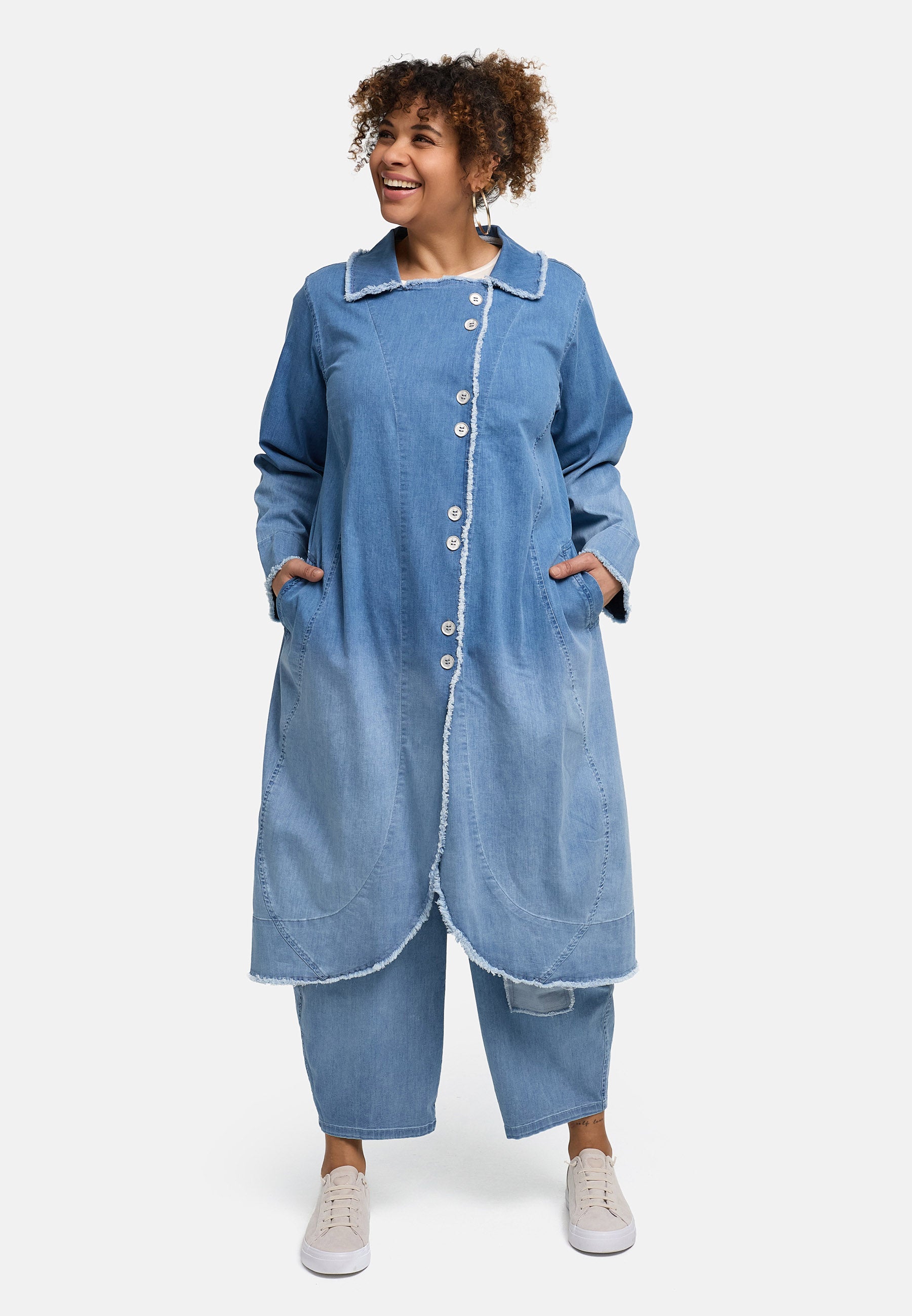 Lässig, elegant und ultrabequem: Der Sky Mantel kombiniert soften Stretch-Denim mit geschwungenen Raw-Edge-Kanten und Ombre-Optik – der perfekte Layer für Übergangstage.