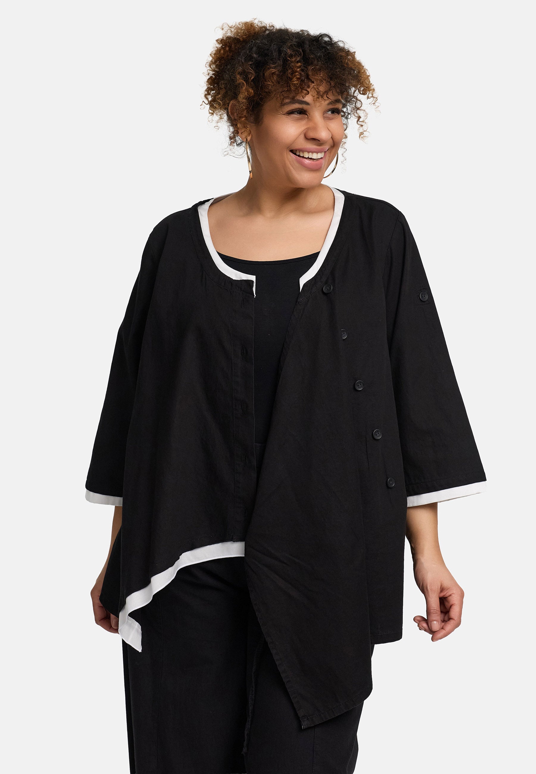 • Λεπτομέρειες: λοξή σειρά κουμπιών, στρογγυλή λαιμόκοψη με αντίθετη επένδυση, μανίκια 3/4 με αναδίπλωση & σταθεροποιητική λωρίδα, αντίθετες λευκές άκρες στο στρίφωμα και τα μανίκια